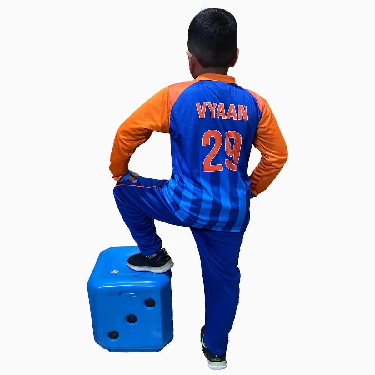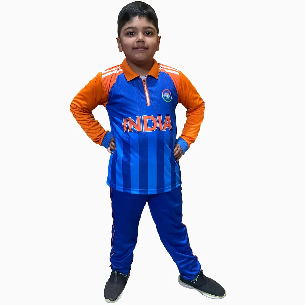 2026 Kids India Dress is great for cricket fans who are looking to enjoy the India cricket game on and off the field. Wearing blue jersey not only brings the passion for the game but also motivates the kids to participate in outdoor activities. Jerseys are made up of premium quick dry fabric with quick dry tech. It helps to evaporate the sweat quickly thereby providing cool comfortable feeling even during long playing hours. This Blue Orange Kids Jersey brings a unique design and style to your Jersey Collection. Standout with our Unique Kids Jersey designs.