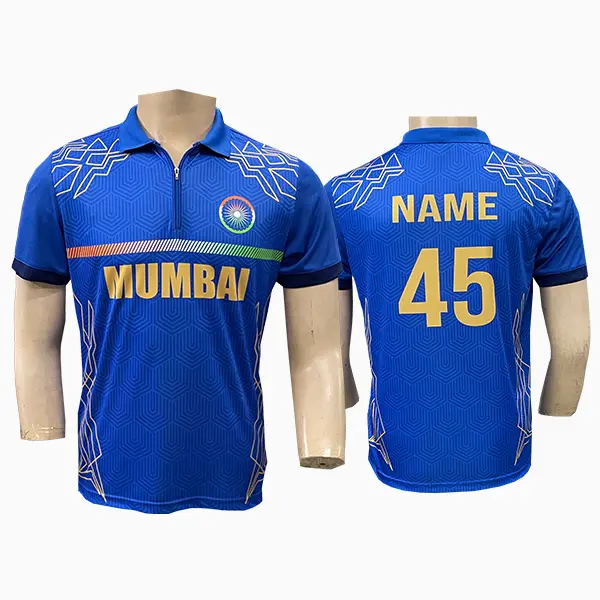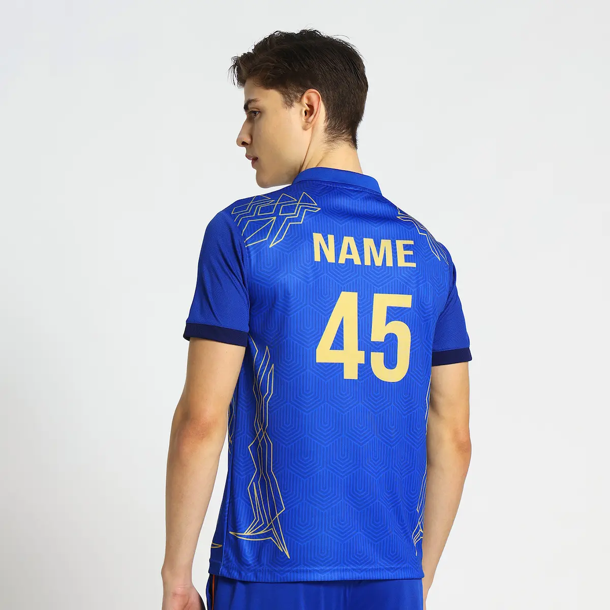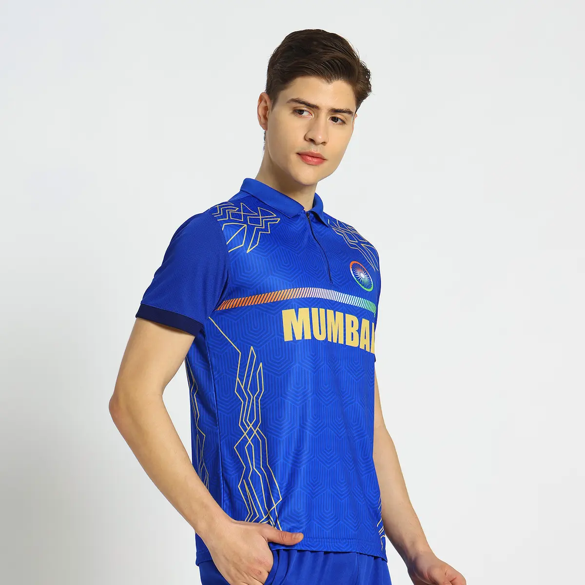 Mumbai Cricket Jersey is a must have for all cricket lovers. Active sports jersey specially designed for playing Cricket. Made up of premium polyester fabric with quick dry technology. It helps to evaporate the sweat quickly thereby providing cool comfortable feeling even during long playing hours. This Royal Blue Cricket Jersey brings a unique design and style to your Jersey Collection. Standout with our Unique Cricket Jersey Designs.
