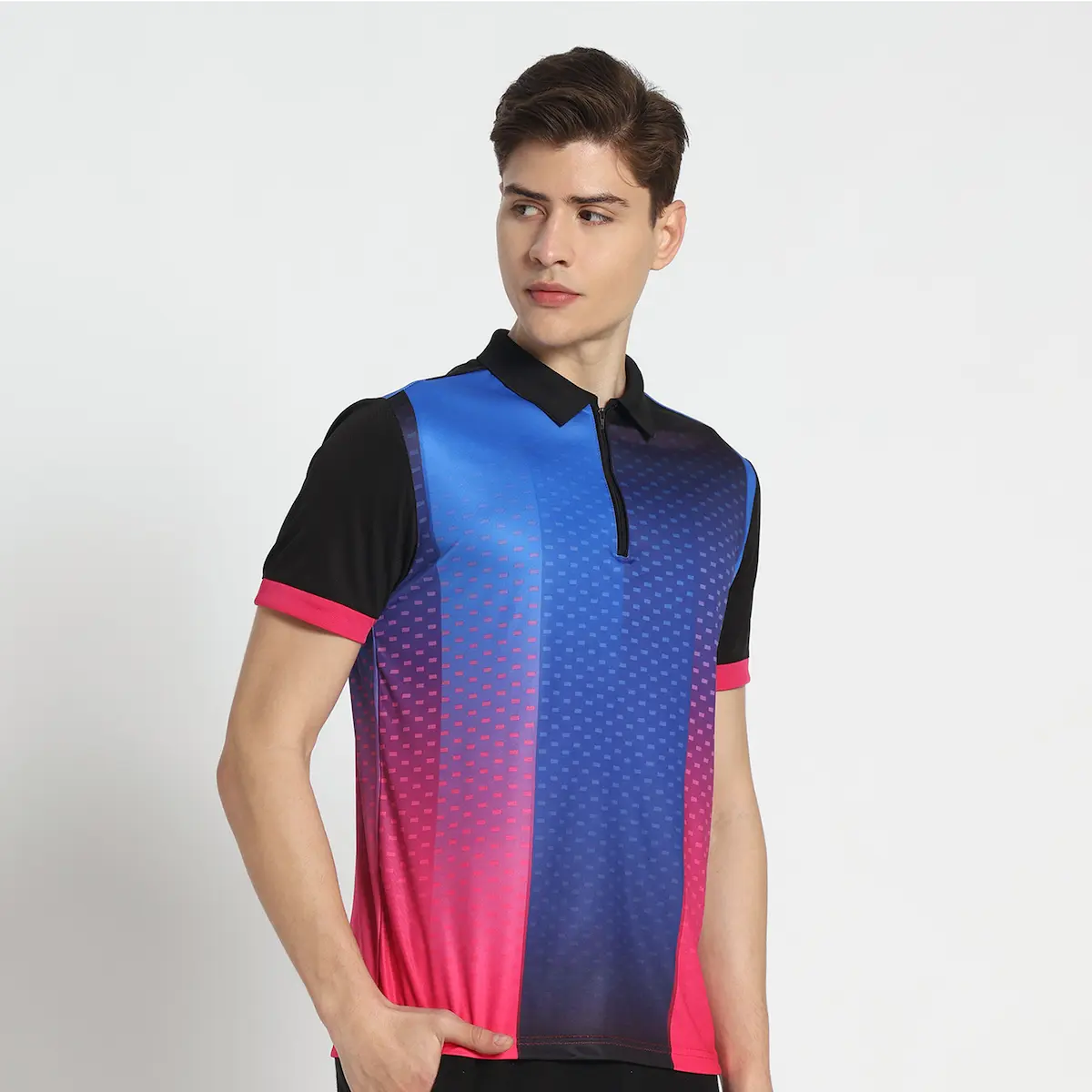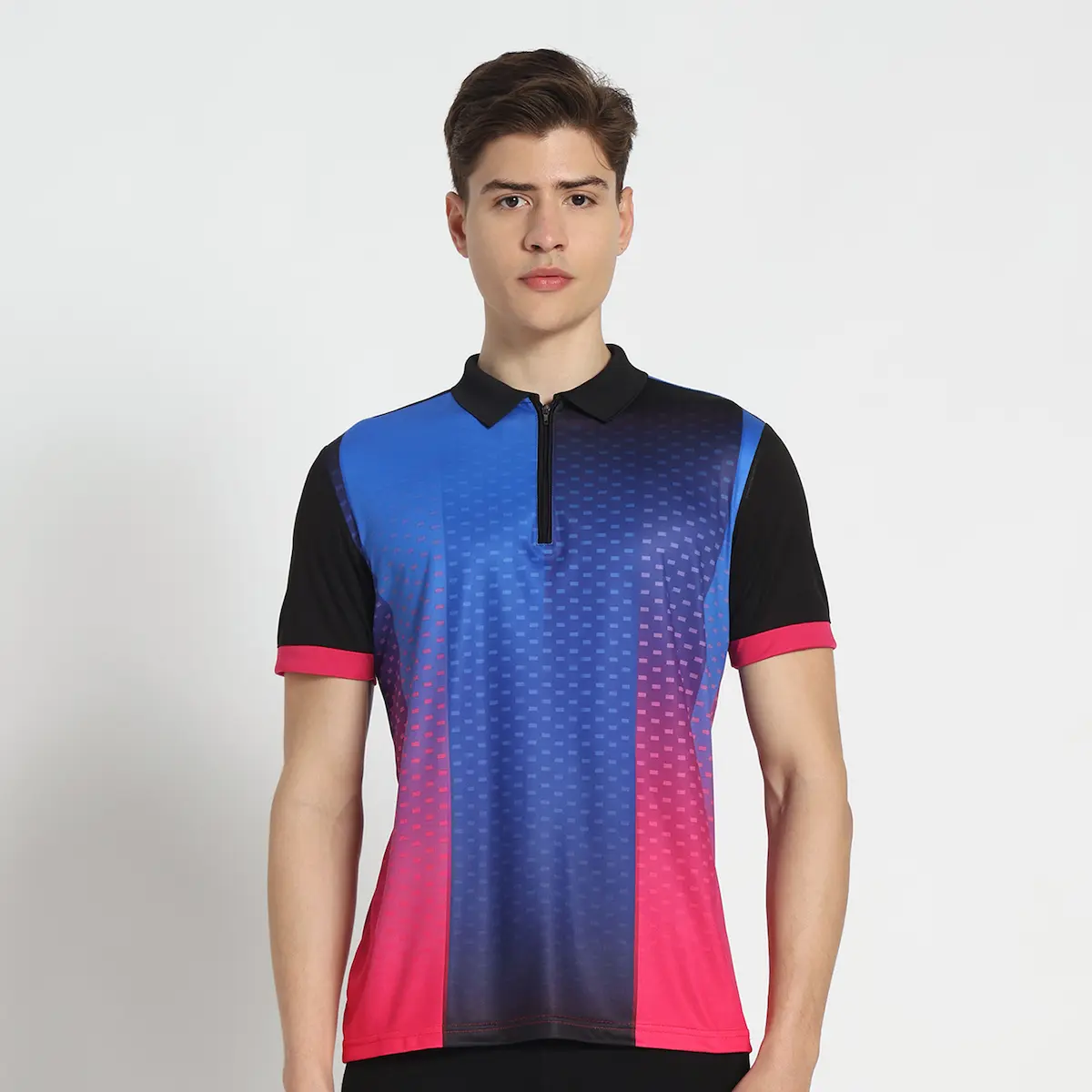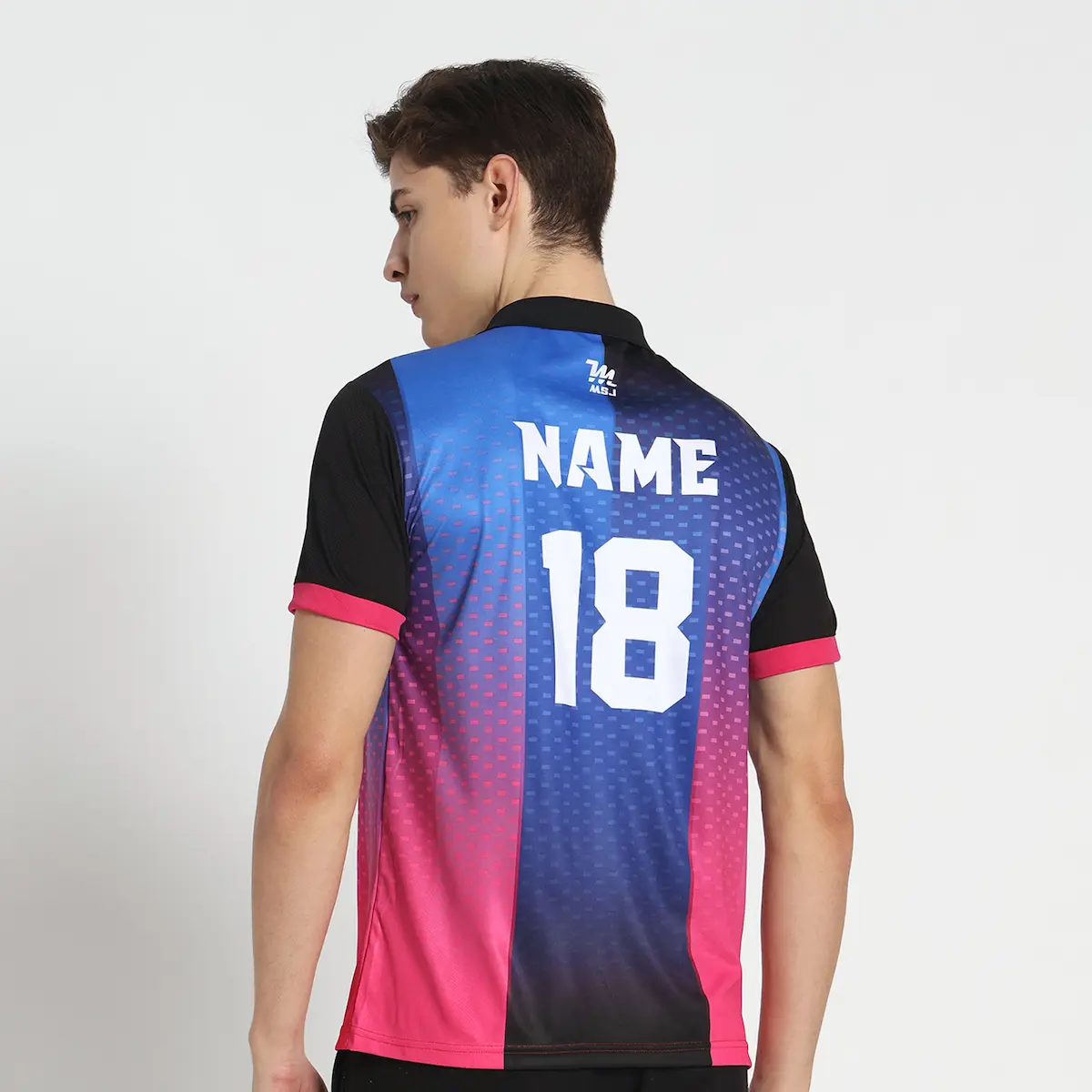Product – This product includes single Pink Blue sublimation jersey. Sleeves of the jersey is Black colour and Name Number is printed on back side in white colour. Tshirt has collar with zip for comfort fit.